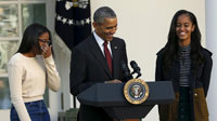 美國總統(tǒng)奧巴馬11月25日照往例在感恩節(jié)前夕赦免了火雞“亞伯”。他還講了雙關(guān)語笑話,感慨任期將至火雞不飛、但時光飛逝,把兩個女兒和在場賓客逗得大笑。