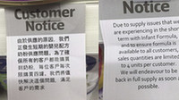 據澳大利亞媒體報道,近日該國Coles和Woolworths等大型連鎖超市于放置奶粉的貨物架上貼上繁體中文標簽,提醒買家因供貨緊缺要限制購買數量。