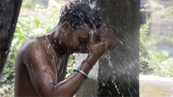 印度加爾各答高溫來襲 民眾室外沖涼降溫