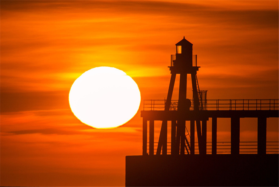 英國惠特比碼頭日出風光 燈塔影影綽綽景色美