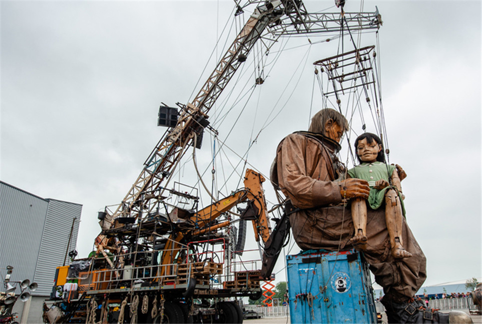 荷蘭呂伐登:巨人木偶飛現劇院門口 驚險創意表演看呆路人