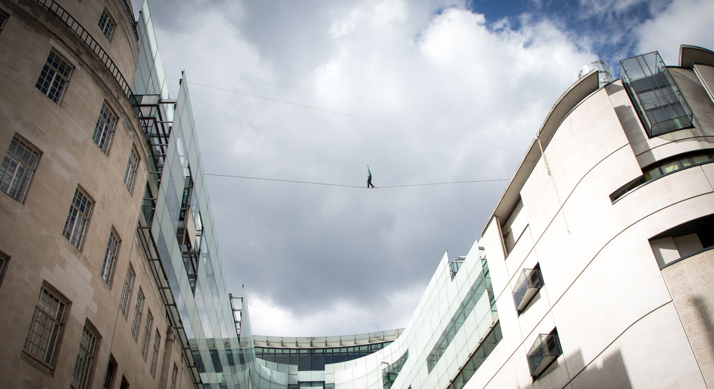 英國(guó)男子BBC大樓上演驚險(xiǎn)一幕 赤腳高空走鋼絲