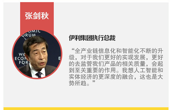 伊利集團執行總裁張劍秋說,“全產業鏈信息化和智能化不斷的升級,對于我們更好的實現發展,更好的去監管我們產品的相關質量,會起到至關重要的作用。我想人工智能和實體經濟的更深度的融合,這也是大勢所趨。”