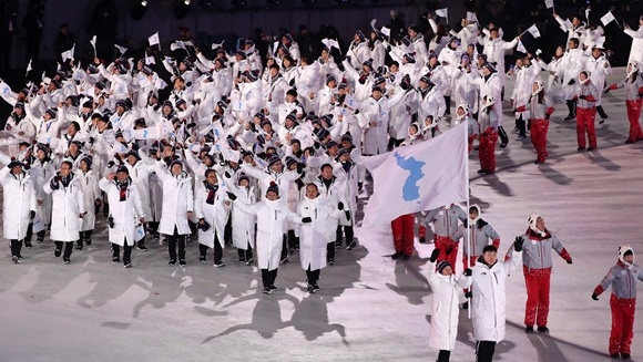 2月9日,朝韓兩國代表團在開幕式上舉“朝鮮半島旗”共同入場。當日,2018年平昌冬奧會開幕式在平昌奧林匹克體育場舉行。