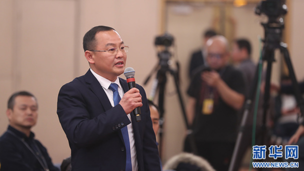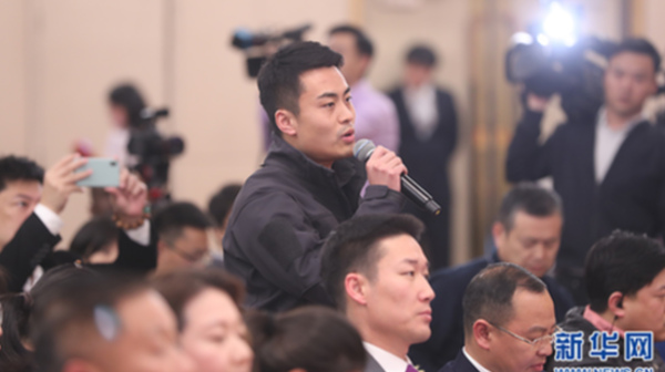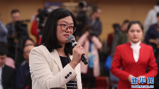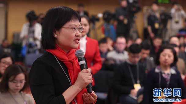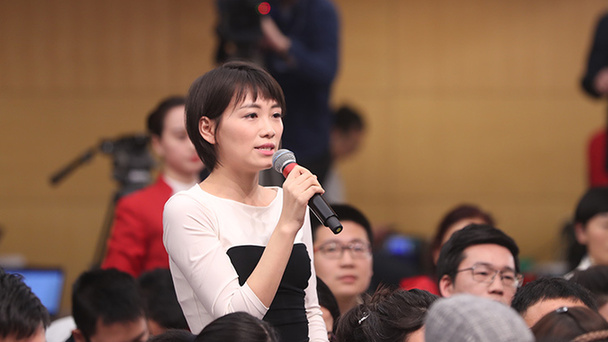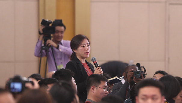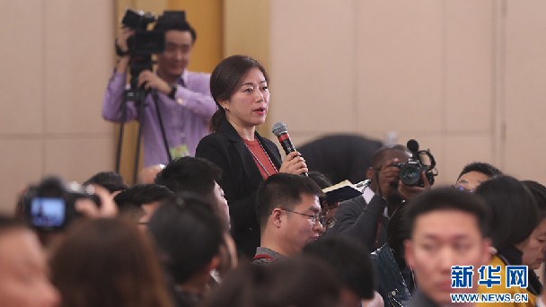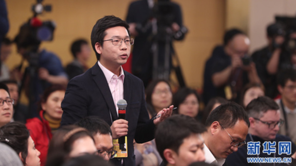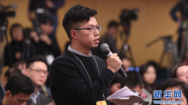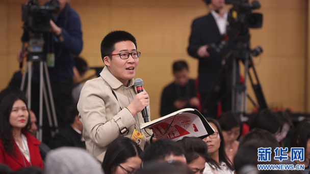 十三屆全國人大一次會議新聞中心于3月7日在梅地亞中心多功能廳舉行記者會,邀請國務院扶貧辦主任劉永富就“打好精準脫貧攻堅戰”的相關問題回答中外記者的提問。圖為四川廣播電視臺記者提問。