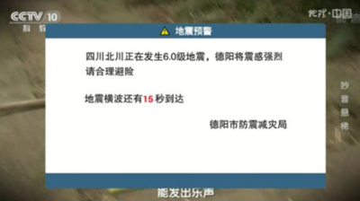 中國開通首批市州電視地震預警,德陽市、宜賓市、綿陽市平武縣、涼山州德昌縣、成都崇州市、成都大邑縣、成都蒲江縣等11個市縣的廣電電視開啟電視地震預警。